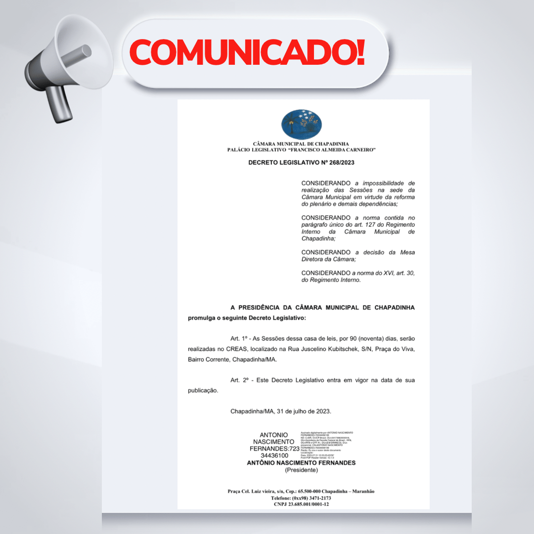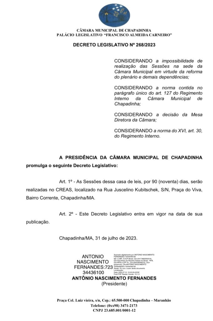 Decreto Legislativo sobre a realização das Sessões Plenárias que serão realizadas no CREAS, em virtude da reforma do plenário e demais dependências.