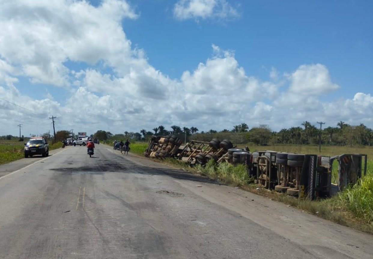 A carreta tombou sobre o acostamento da rodovia e o condutor se evadiu do local.