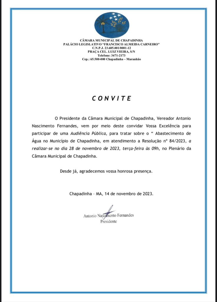 ACONTECE NESTA TERÇA, (28), NA CÂMARA MUNICIPAL, A AUDIÊNCIA PÚBLICA SOBRE O ABASTECIMENTO DE ÁGUA NO MUNICIPIO DE CHAPADINHA. Blog TV Baixo Parnaíba 27 de novembro de 202327 de novembro de 2023tvbaixoparnaiba.com.brLeave a Comment on ACONTECE NESTA TERÇA, (28), NA CÂMARA MUNICIPAL, A AUDIÊNCIA PÚBLICA SOBRE O ABASTECIMENTO DE ÁGUA NO MUNICIPIO DE CHAPADINHA. Facebook WhatsApp