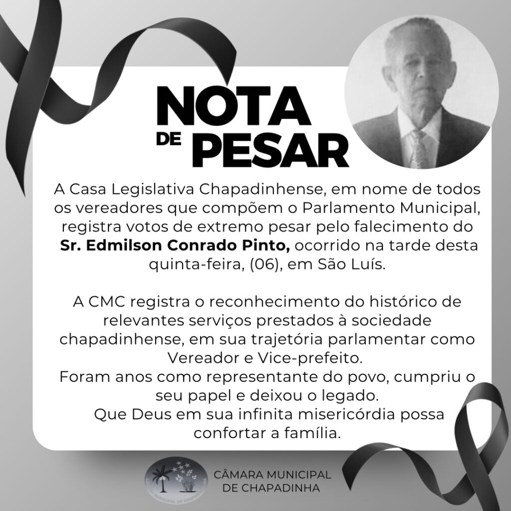 CÂMARA DE CHAPADINHA EMITE NOTA DE PESAR DO FALECIMENTO DO SR. EDMILSON CONRADO PINTO: VEJA NA ÍNTEGRA Notícia 6 de junho de 20246 de junho de 2024tvbaixoparnaiba.com.brLeave a Comment on CÂMARA DE CHAPADINHA EMITE NOTA DE PESAR DO FALECIMENTO DO SR. EDMILSON CONRADO PINTO: VEJA NA ÍNTEGRA Facebook WhatsApp