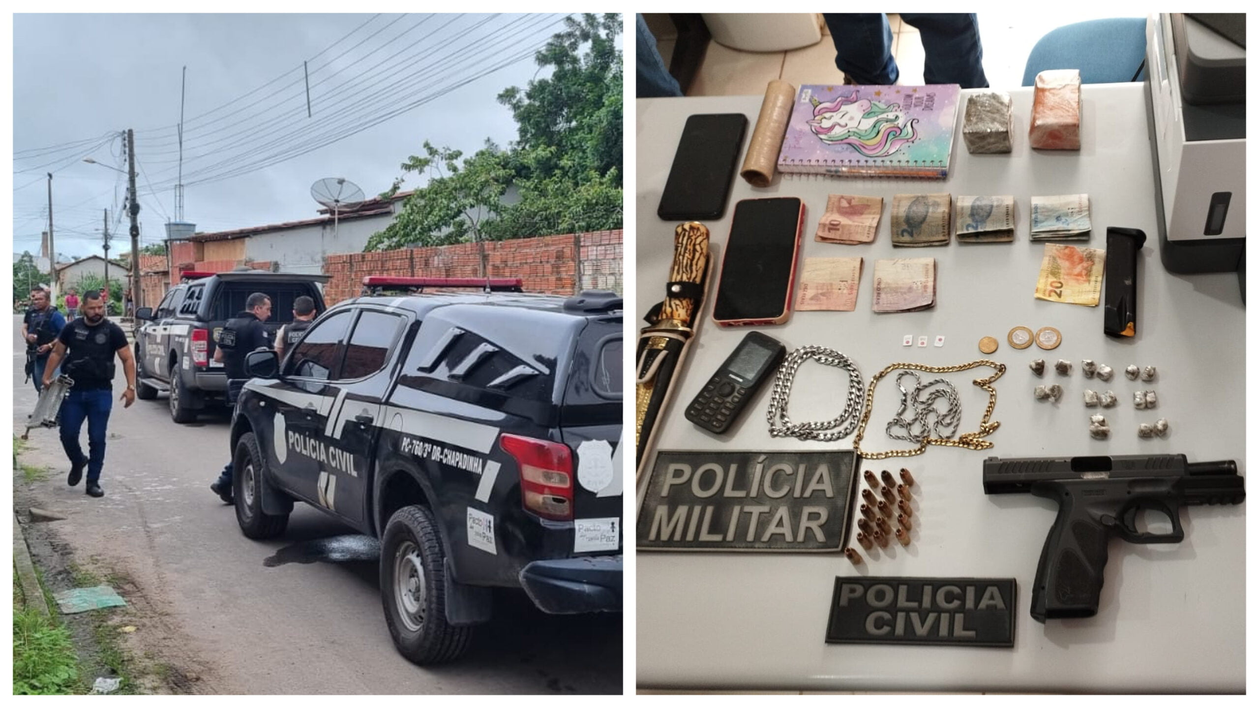 Na operação policial, foram apreendidos uma arma de fogo do tipo pistola calibre 9mm com numeração raspada, porções de maconha, dinheiro em espécie e outros apetrechos comumente utilizados para a comercialização de entorpecentes.