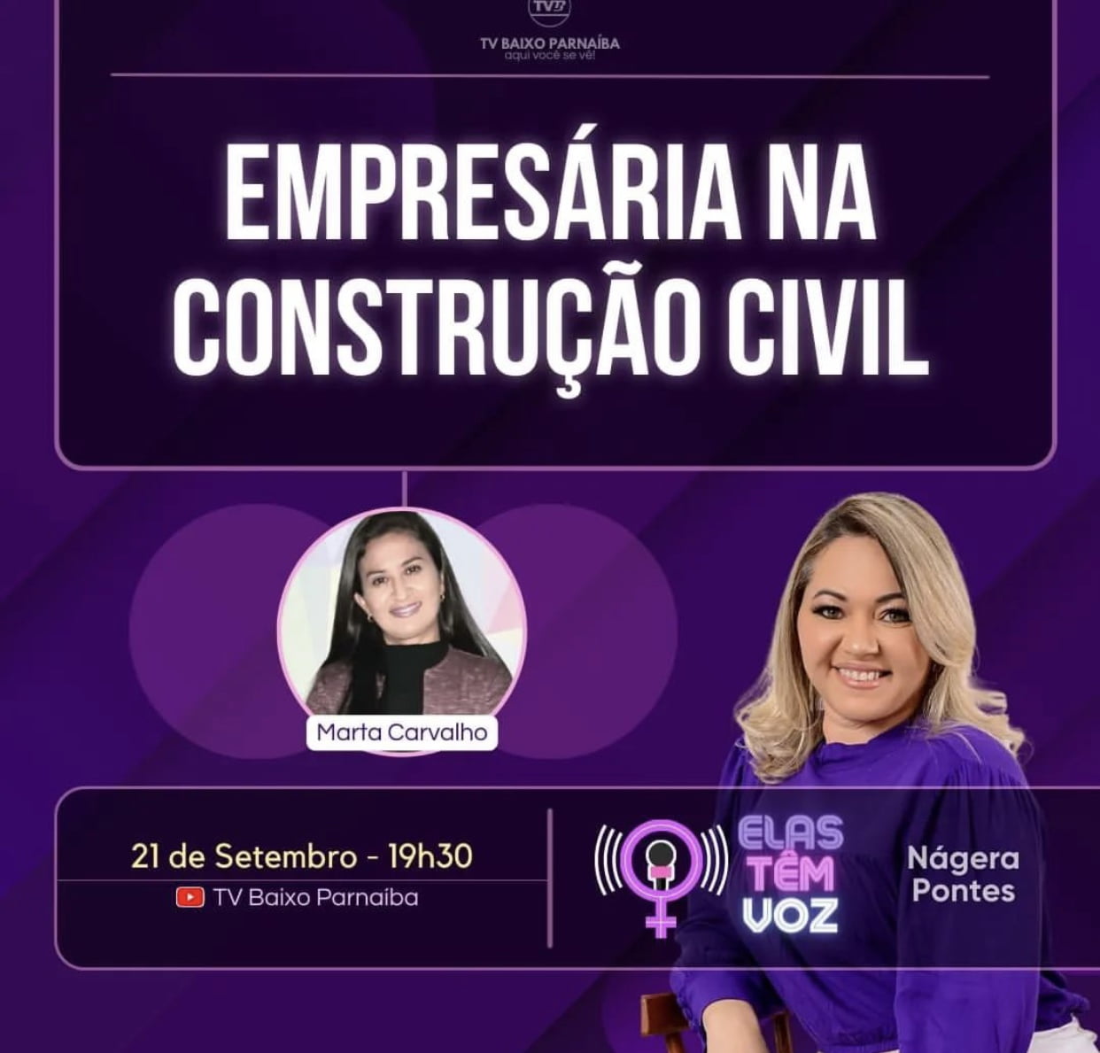 ELAS TÊM VOZ ED.21.09.2023 Podcast 21 de setembro de 202321 de setembro de 2023tvbaixoparnaiba.com.brLeave a Comment on ELAS TÊM VOZ ED.21.09.2023 Participação com a Marta Carvalho abordado o tema Empresária na construção civil. Facebook WhatsApp
