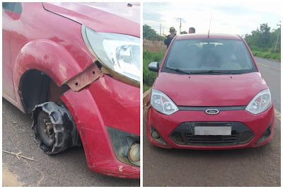 Na tarde deste sábado (04), por volta das 17h05, uma equipe PRF se encontrava na Unidade Operacional, no km 412 da BR-230, no município de Balsas, quando visualizou um veículo Ford/Fiesta, de cor vermelha, trafegando no sentido decrescente da rodovia sem condições de circulação: estava sem o retrovisor esquerdo (lado do motorista), sem o pneu dianteiro direito (apenas a roda em contato com o pavimento) e com uma criança no banco da frente sentada nas pernas de outra ocupante.