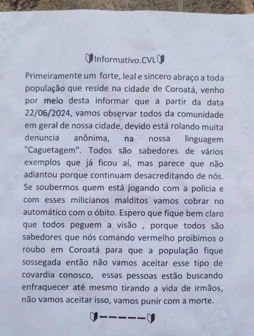 A polícia militar realizou uma operação para recolher cartas de intimidação que foram coladas em postes e muros dos bairros Novo Areal, Maçaranduba e Mocó, em Coroatá. As mensagens, assinadas supostamente por membros do Comando Vermelho (CV), ameaçam de morte aqueles que fornecem informações sobre a facção à polícia e também indivíduos que cometem roubos nos bairros da cidade.