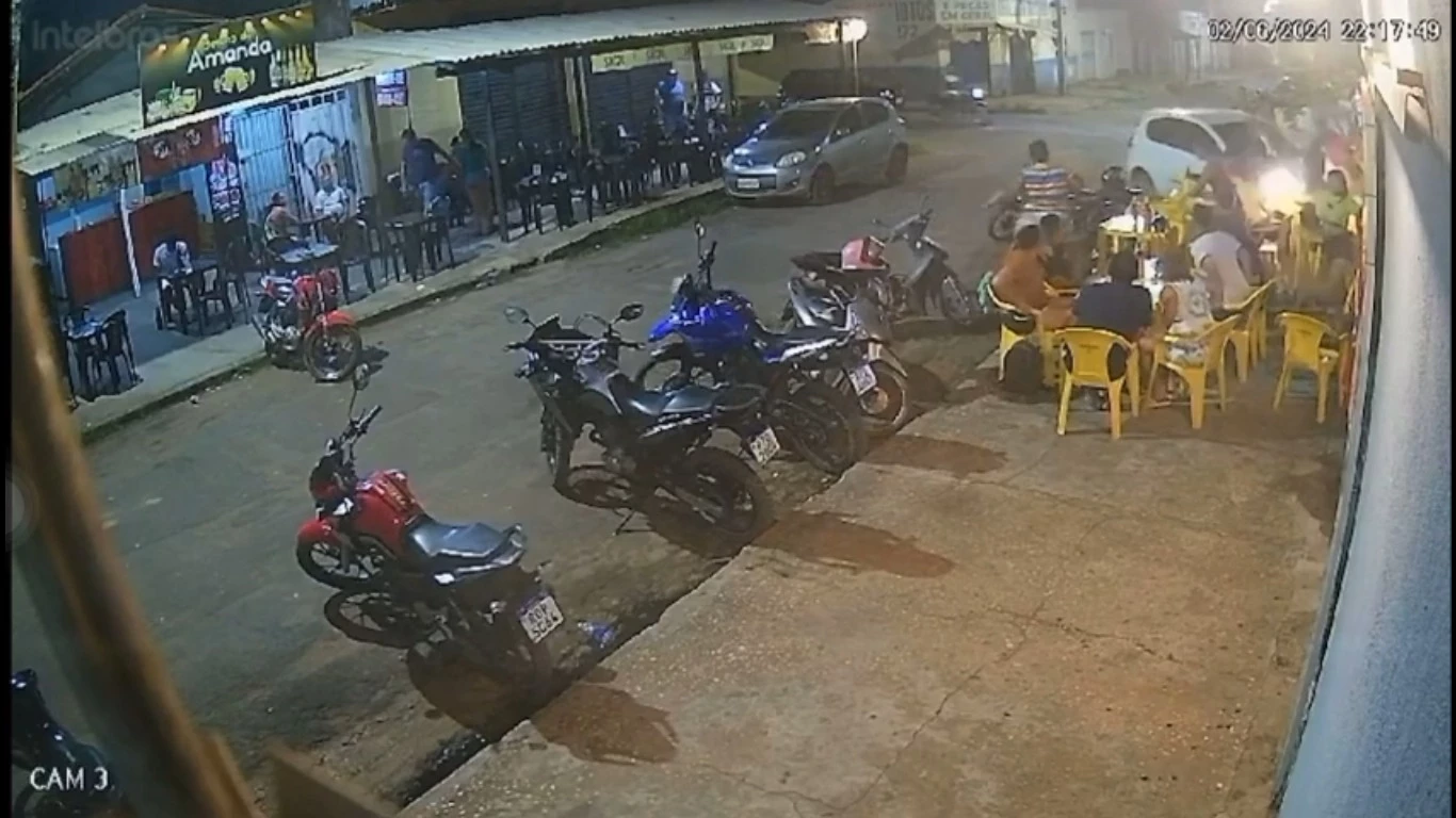 Em um vídeo registrado por uma câmera de segurança no local, é possível observar o momento em que o carro branco atinge as pessoas que estão sentadas nas mesas.
